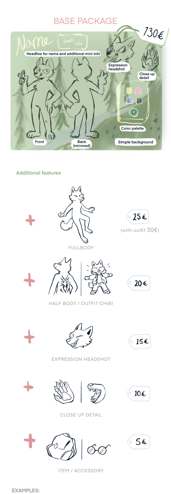 There is standard ”Base package” for Reference sheet commission where you can put more additional features.If you want less things in your reference sheet than what is included in base package, we can discuss for the right price for you.Prices are indicative, if you had pick many additional features I can give a small discount for you.Very complex character designs can raise the price.