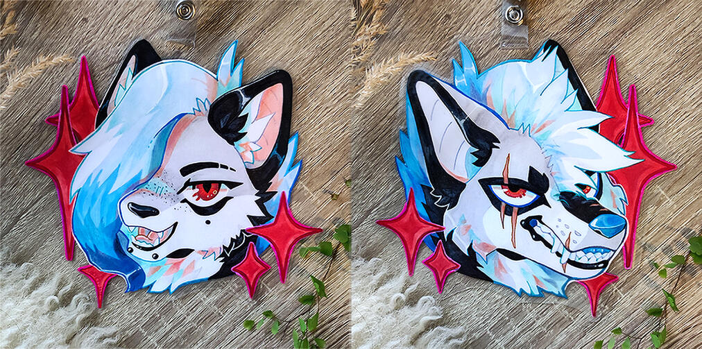 🔸130 € - Same character, different expression, colors..When ordering two different characters in same badge you much understand that drawing area will be limited so characters can't be so hugely different from each others. e.g. character with ears and another without are difficult to combine, but some props can help with this issue such as plant leaves and so on. Please, lets discuss can your characters and props work in double sided badge.Also when ordering name tag to double sided badge, its limits the styles for them e.g. I can't cut text outlines because it will appear backwards on the other side.I prefer that when ordering same character that sides have each different expressions, because in traditional art it would be pain for me get them exactly a like. I'm perfectionist :'c